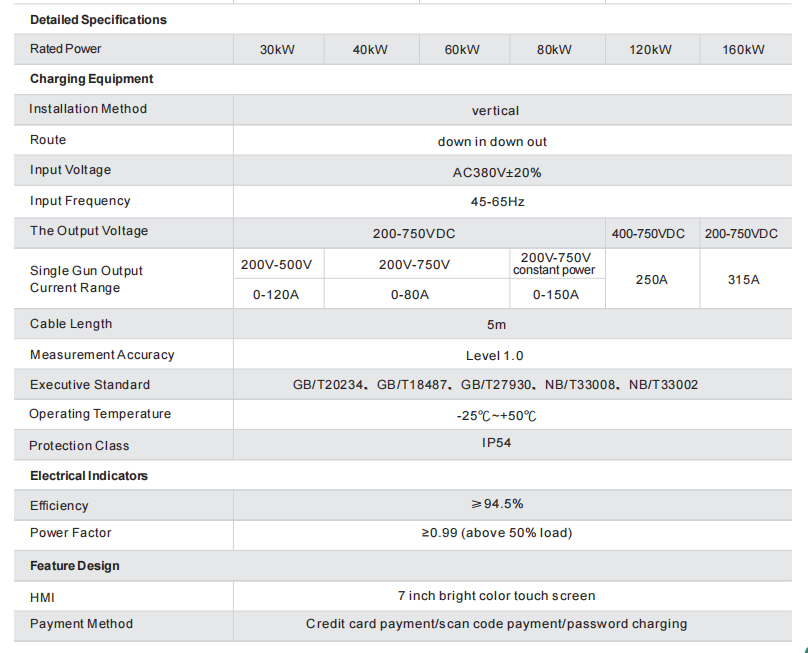 1) Faixa de energia da estação de carregador: 30kW ~ 160kW.